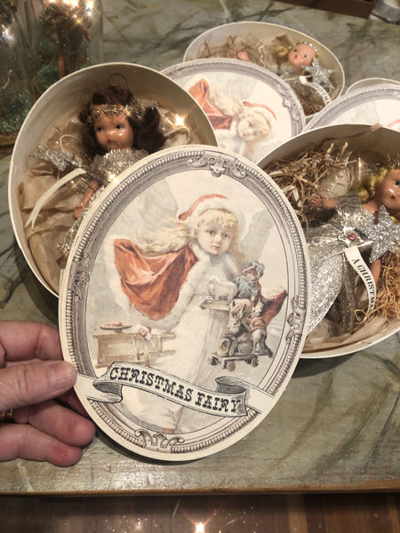 We clothed these cherubic antique dolls as Christmas Fairies! Featuring handmade dresses adorned with Dresden, French boullion twisted wire, and mica frost. Each one holds a star wand and has tiny translucent tarleton wings. A delightful treat to display anywhere! Each one comes in it’s own box.