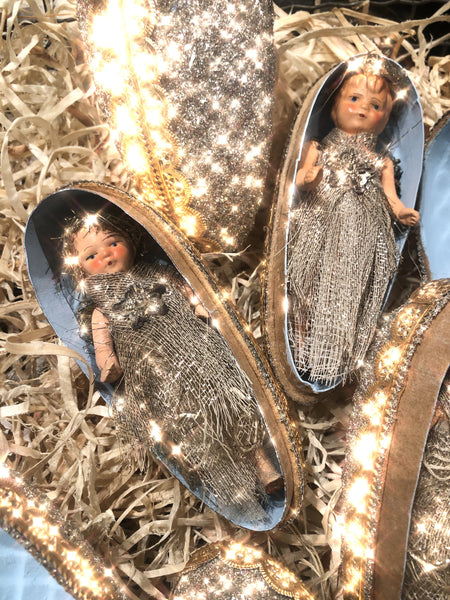 These tiny fairies are housed in vintage German pressed-paper pinecones hand-glittered with our silver glass glitter. Each fairie is an antique German miniature doll, dressed in shimmering antique lame and lametta scraps from a bygone era, and each one has a tiny pair of golden tinsel wings. Straight out of a forest fantasy. Very limited edition.