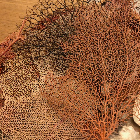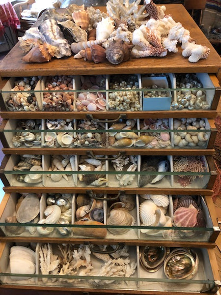 Using a variety of beautiful old shells I have collected over the past 30 years, you will craft a standing arrangement designed around either an antique Victorian scrap figure or one of our own artisan cast hands, and add elements of mosses, small and large shells, coral, glitter, and pull apart metal bouillon. This beautiful memento is finished off with a tiny message banner.