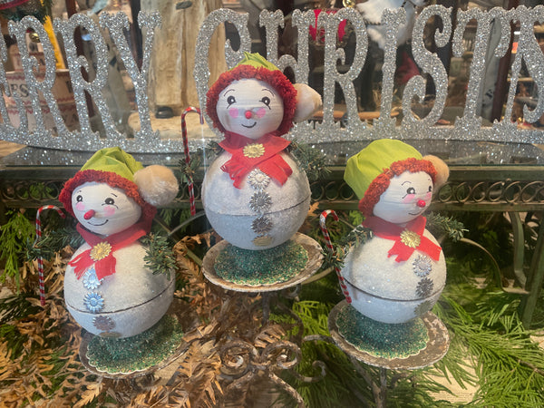 These snowmen are made just like they were in the old days! The body of each one is a vintage German paper mache ball with snowy glitter, and each one opens up to reveal candy or other small gifts. The faces are hand painted on a spun cotton ball and topped with a tiny hat or stocking cap made from antique crepe paper. They are all holding a vintage candy cane ornament.