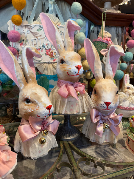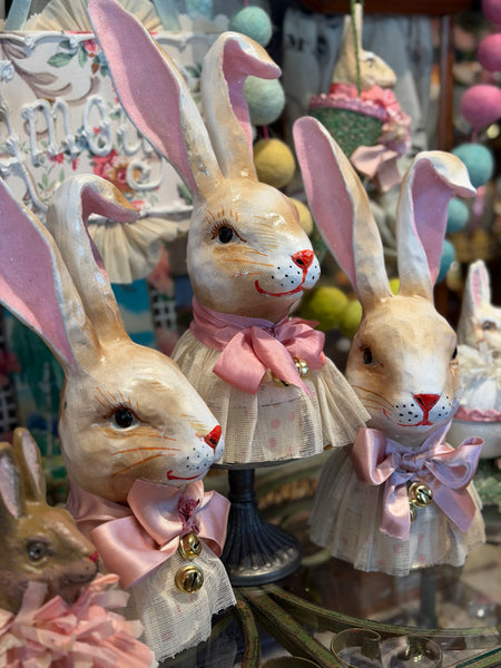Our noble Easter Bunny is ready to preside over your Spring festivities! Each one is hand painted by Wendy, with touches of clear glass sparkling glitter, and also has a pink silky ribbon over a fluffy antique buckram or crepe paper neck ruff, sort of a tutu around his neck! with a tinkly brass bells.